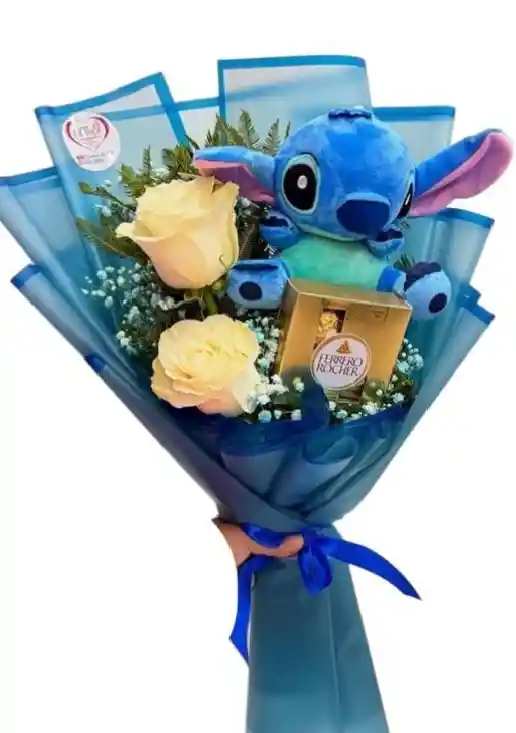 Contiene 1 peluche stitch azul o rosado 2 risas blancas Chocolates Ferrero x4 Follaje Tarjeta personalidad Ramo para hombre Ramo de mujer Ramo de graduación Ramo feliz día Ramo feliz cumpleaños
