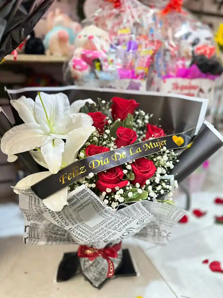 RAMO LIRIOS Y ROSAS ROJAS DECORADAS EN BASE DE PAPEL COREANO