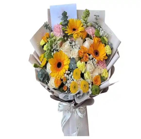 RAMO DE ROSAS, GERBERAS, TIPOLO, EUCALIPTUS, DECORADO EN PAPEL COREANO