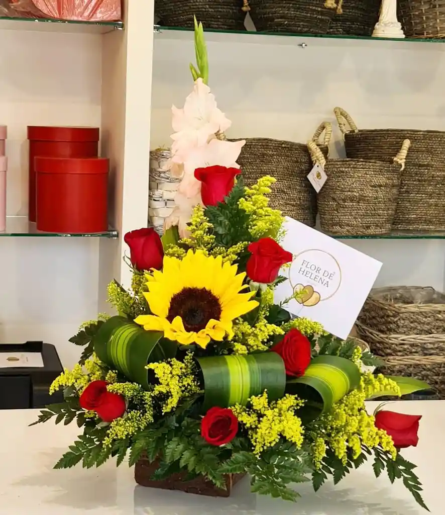 Hermoso diseño floral tradicional, elaborado por Floristería Flor de Helena hecho con rosas frescas, girasol, hoja de dracena, solidago amarillo, helecho cuero, gladiolo, en una base cuadrada de madera.
