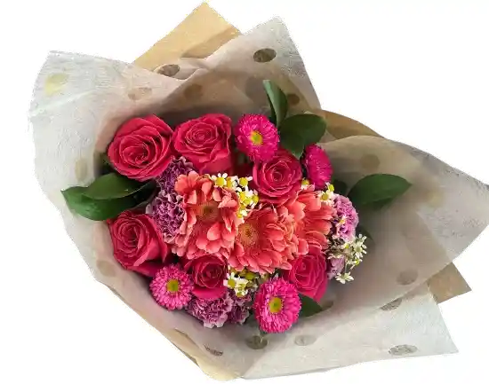 Un vibrante ramo con rosas fucsias, gerberas coral, margaritas y flores mixtas en tonos rosados. Ideal para regalar alegría, amor y dulzura en cualquier ocasión especial.