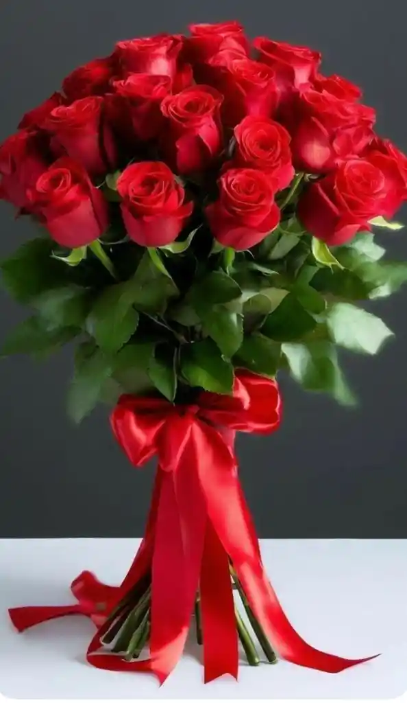 Un ramo clásico y refinado de rosas rojas de tallo largo, símbolo eterno de amor y pasión. Acompañadas de follaje verde intenso y terminado con un lazo de satín rojo brillante que realza su sofisticación. Ideal para momentos románticos y expresiones sinceras de afecto.