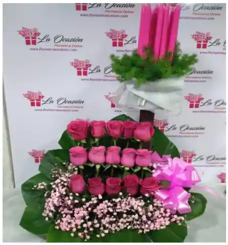 Ramo en base cuadrada con 15 rosas, yipso, moño y follaje