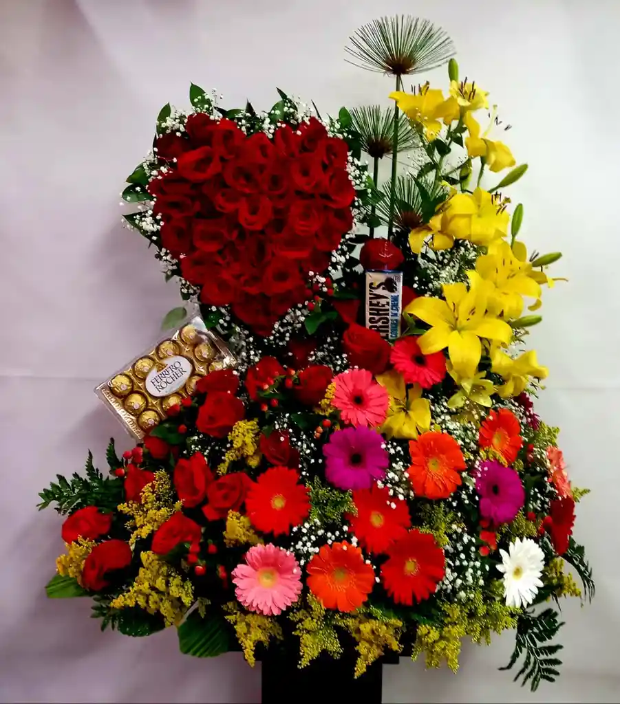 Ramo En Base Doble Con Corazón En Rosas, Gerberas, Lirios Y Rosas