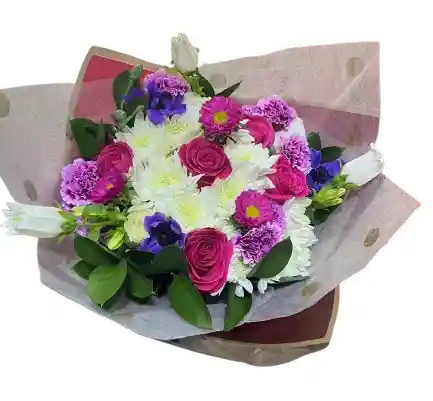 Un elegante ramo con rosas fucsias, margaritas blancas, claveles y toques morados que combinan frescura y alegría. Perfecto para expresar amor, gratitud o celebrar un momento especial con color y estilo.