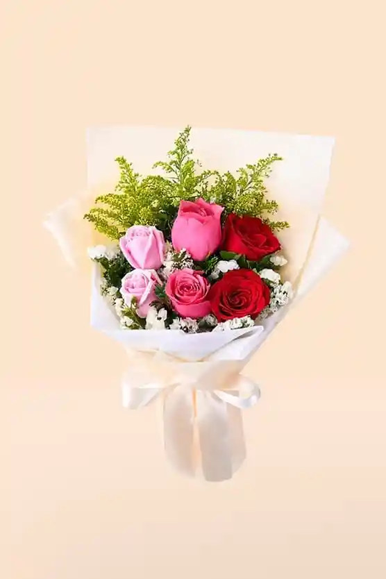 Sorprende con el delicado encanto del ramo "Encanto Romántico". Este arreglo combina rosas rojas, rosadas y lilas, acompañadas de suaves toques de gypsophila y un follaje verde fresco, todo envuelto en un elegante papel beige con un lazo de satén. Perfecto para expresar amor, gratitud o admiración, este ramo es una obra de arte floral que transmite ternura y sofisticación en cada pétalo. Ideal para ocasiones especiales o simplemente para alegrar el día.