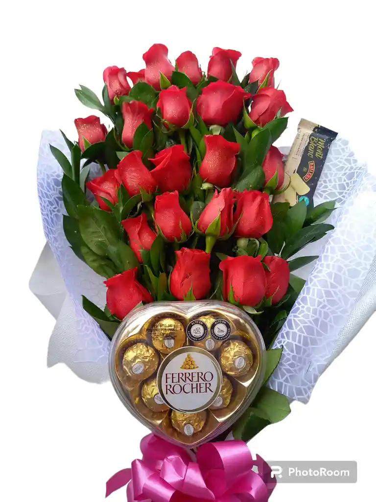 Ramo de mano (Bouquet) de 24 rosas rojas o del color de su preferencia (según disponibilidad de la tienda) acompañdo de follaje variado, ferrero corazón y Mont Blanc