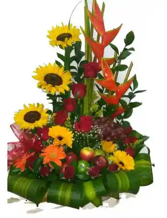 Ramo de flores exoticas. Tamaño aprox. 85 cm. Contenido: 14 rosas 3 girasoles 2 heliconias Frutas: 2 granadillas, Hojas de Dracena, manzana roja, manzana verde, Moño, pera, tarjeta. Follaje: Rusco., uvas. base de madera