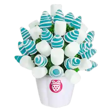 Ramo Frutal Con Exquisitos Marshmallows y Fresas Con Chocolate Azul y Líneas de Chocolate Blanco. ¡Sorprende Con un Obsequio Único y Original! Mejores Regalos Que Las Rosas o Los Arreglos de Flores; Obsequia Arreglos Frutales Con Decofruta.