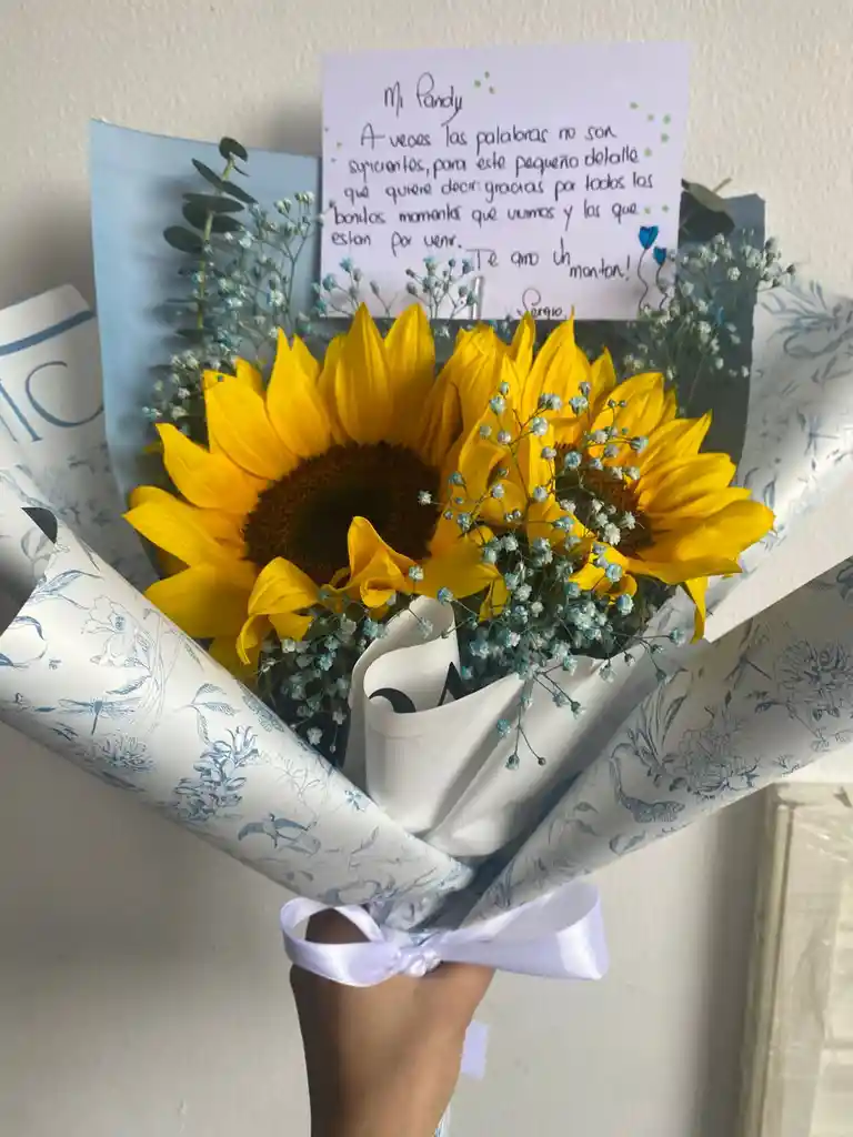 Girasoles perfectos para regalo! Dos girasoles grandes premium envueltos en Jipsu azul fon delicados toques de eucalipto baby envuelto en papel de lujo y tarjeta personalizada. Puedes enviarnos el mensaje por el chat del repartidor