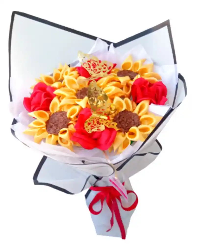Descubre el Ramo de girasoles y rosas un detalle único que llena de vida y color cualquier espacio. Ideal para regalar o para Embellece su día.