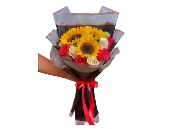 RAMO DE GIRASOLES Y ROSAS, DECORADO EN PAPEL COREANO.