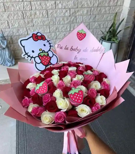 contiene: rosas rojas x15, rosas rosadas x15, rosas blancas x15, decoración de hello kitty con fresitas en papel opalina y mensaje personalizado