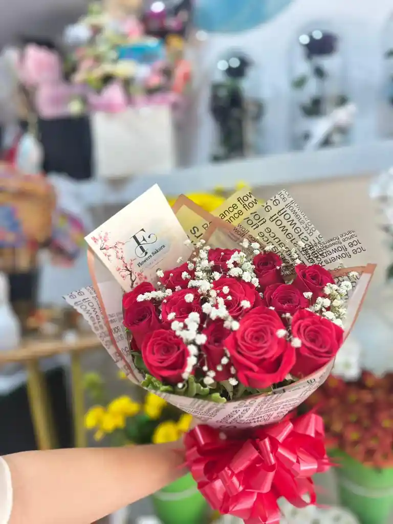 ramo 12 rosas rojas decoradas en yipsofilia papel coreano,moño y tarjeta