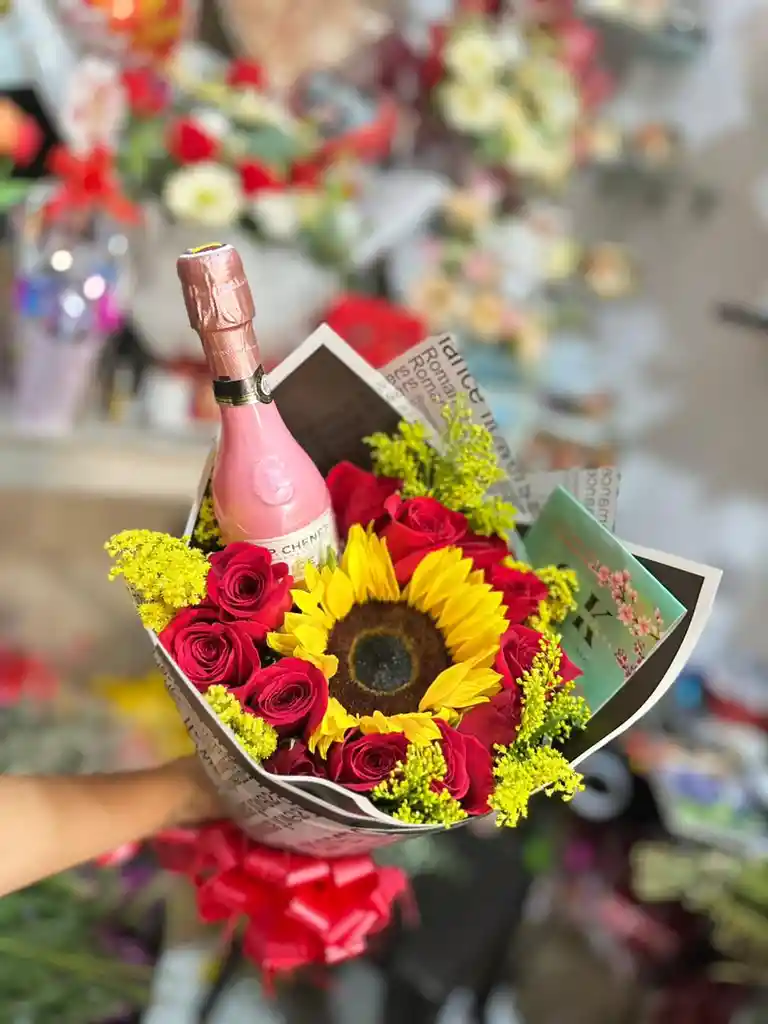 RAMO GIRASOL CON ROSAS Y JP DECORADO EN PAPEL COREANO