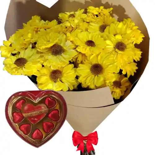 ✨ Combo Ramo de Margaritas Amarillas + Chocolates Corazón (7 unds) ✨ Un regalo lleno de ternura y dulzura para sorprender a esa persona especial. 💝 Este combo incluye: 💐 Un hermoso ramo de margaritas frescas, símbolo de pureza, amistad y alegría. 🍫 Una cajita de 7 chocolates en forma de corazón, elaborados con suave y delicioso chocolate para endulzar el momento.