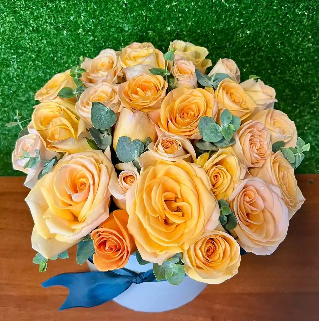 Un diseño cálido y encantador con rosas en tonos miel y durazno, acompañado de un toque de eucalipto fresco. Arreglado en una elegante caja blanca con lazo satinado, es el detalle perfecto para transmitir dulzura, gratitud o afecto sincero.