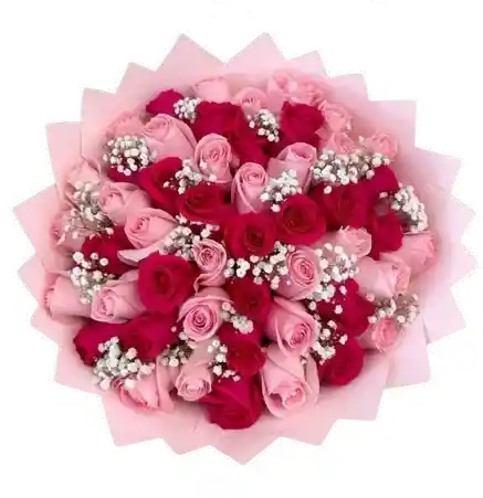 Un impactante ramo que combina la intensidad de las rosas rojas con la suavidad de las rosas rosadas, creando un contraste elegante y lleno de emoción. Acompañado de delicados toques de gypsophila y envuelto en tonos rosados, este diseño transmite amor, pasión y ternura en perfecta armonía 💐🌸 Elaborado con flores frescas de calidad premium, este arreglo destaca por su diseño profesional y su presencia vibrante. Es ideal para sorprender en ocasiones especiales como aniversarios, declaraciones de amor o celebraciones inolvidables 🌷 Algunas flores o tonalidades pueden variar ligeramente según disponibilidad de temporada, garantizando siempre la frescura y belleza del arreglo. Incluye una tarjeta personalizada gratis para que puedas expresar tus sentimientos con un mensaje único.