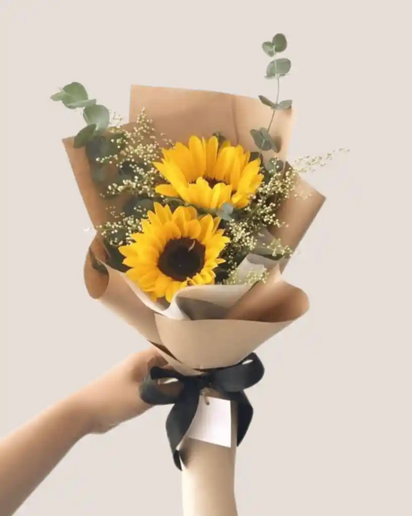 Un ramo pequeño, pero con un gran mensaje. ☀️ Dos girasoles que representan luz, alegría y energía positiva, acompañados de caspia blanca —símbolo de ternura y buenos deseos— y eucalipto fresco que aporta serenidad. El empaque en papel kraft con lazo negro le da un toque natural y sofisticado, ideal para un detalle espontáneo o una sorpresa de cariño. 📩 Si deseas incluir un mensaje, por favor envíalo por el chat de Rappi (los comentarios no los podemos visualizar).