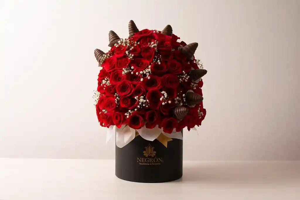 Ramo con base tipo cuerina Negra. elaborado aproximadamente con 160 a 180 rosas naturales. toques de gyposophilia y 8 fresas cubiertas de chocolate negro con rayas de chocolate semiamargo
