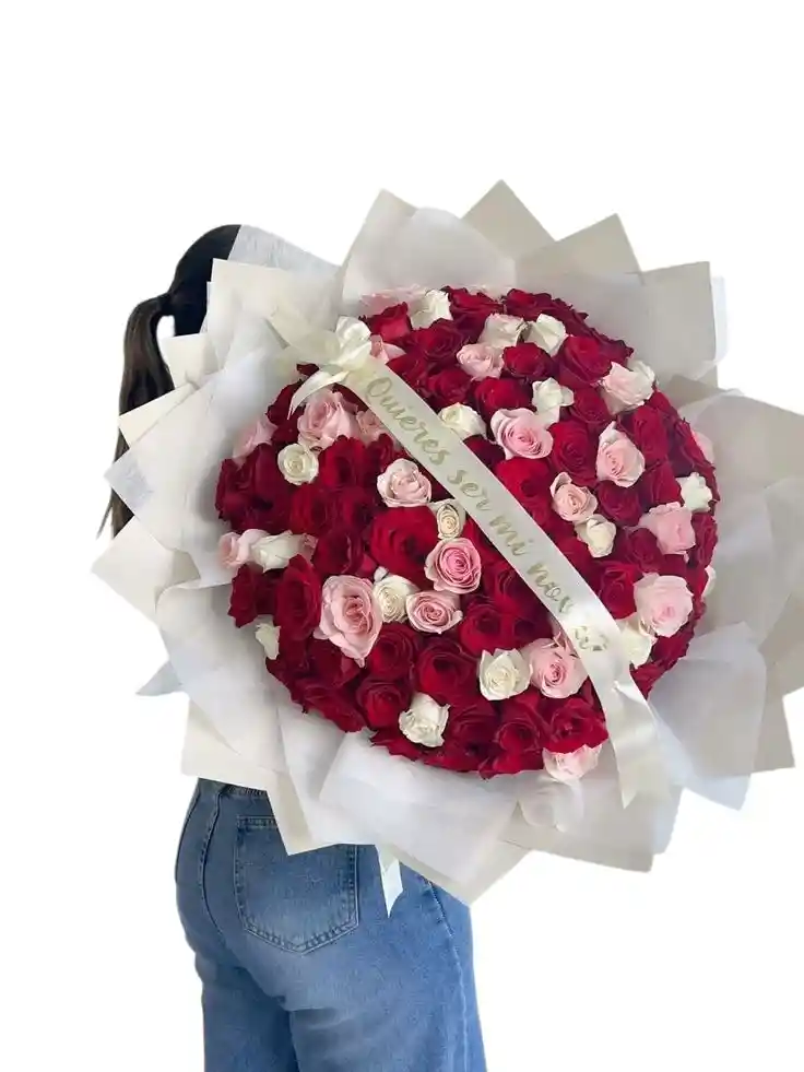 con este espectacular y voluminoso ramo premium, diseñado especialmente para momentos decisivos. Esta composición masiva combina la pasión de las rosas rojas con la delicadeza de rosas rosa pastel y blancas, creando un contraste vibrante y romántico.