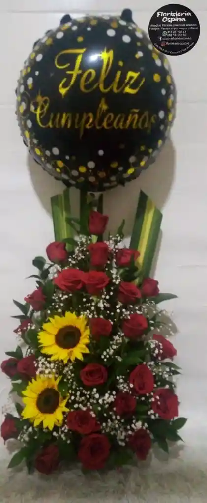 Radiante y romántico, el arreglo Radiante y romántico, el arreglo “Brindis de Amor” es una celebración en forma de flores. Compuesto por intensas rosas rojas, vibrantes girasoles y un elegante globo de cumpleaños, este diseño combina pasión, alegría y ternura en un solo detalle. Las delicadas nieves blancas complementan el conjunto con un toque de suavidad y encanto. Perfecto para sorprender en un cumpleaños especial, este arreglo transmite emoción, cariño y un deseo profundo de ver sonreír a quien lo recibe. 💌 Si deseas incluir una tarjeta, debes solicitarla al momento de hacer tu pedido. Sugerencia de mensaje para la tarjeta: "Hoy celebro tu vida, y la dicha de tenerte en la mía." Disponible en Floristería Ospina, donde cada detalle se diseña con amor para hacer de cada momento algo inolvidable. El tipo de globo, follaje y base pueden variar según la disponibilidad en tienda. es una celebración en forma de flores. Compuesto por intensas rosas rojas, vibrantes girasoles y un elegante globo de cumpleaños, este diseño combina pasión, alegría y ternura en un solo detalle. Las delicadas nieves blancas complementan el conjunto con un toque de suavidad y encanto. Perfecto para sorprender en un cumpleaños especial, este arreglo transmite emoción, cariño y un deseo profundo de ver sonreír a quien lo recibe. 💌 Si deseas incluir una tarjeta, debes solicitarla al momento de hacer tu pedido. Sugerencia de mensaje para la tarjeta: "Hoy celebro tu vida, y la dicha de tenerte en la mía." Disponible en Floristería Ospina, donde cada detalle se diseña con amor para hacer de cada momento algo inolvidable. El tipo de globo, follaje y base pueden variar según la disponibilidad en tienda.