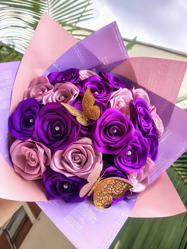 Ramo de rosas eternas x 25 con papel coreano lila con rosado