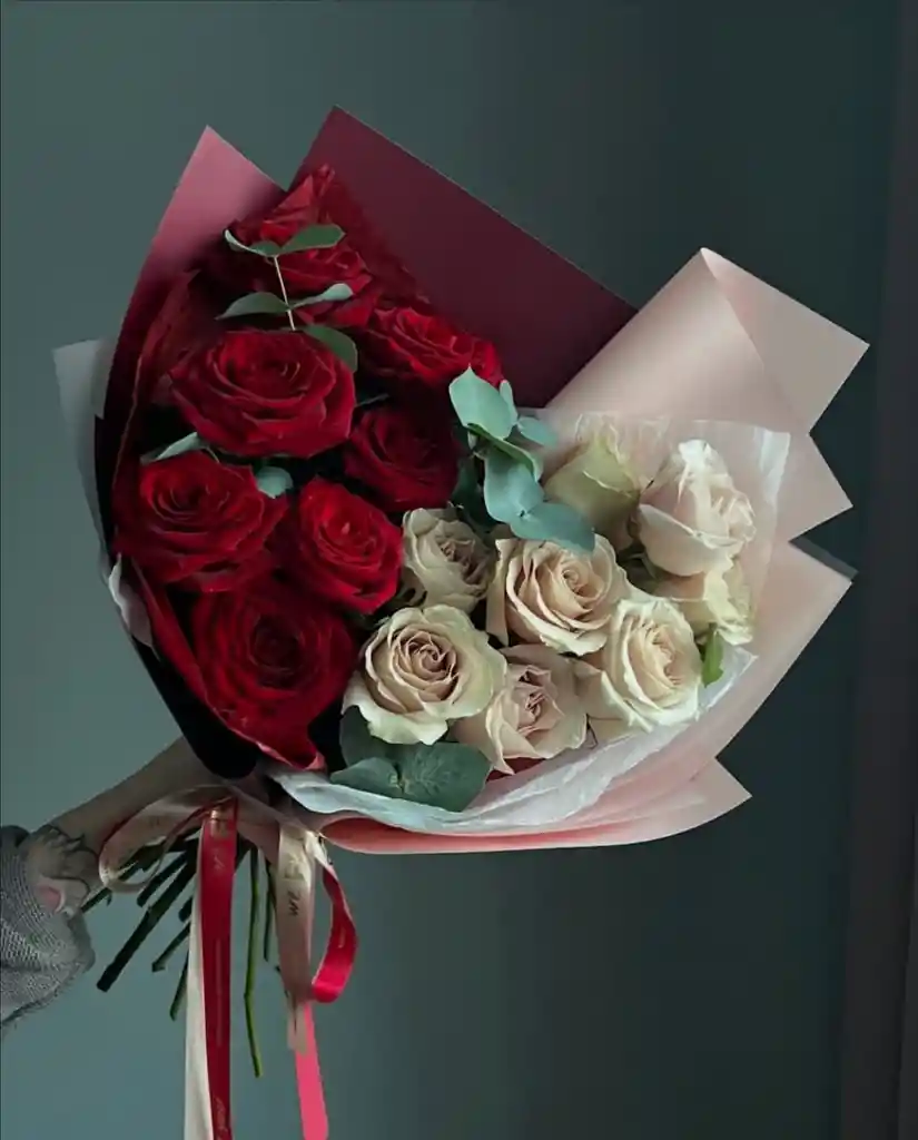 hermoso ramo, mitad rosas rojas y mitad rosas blancas