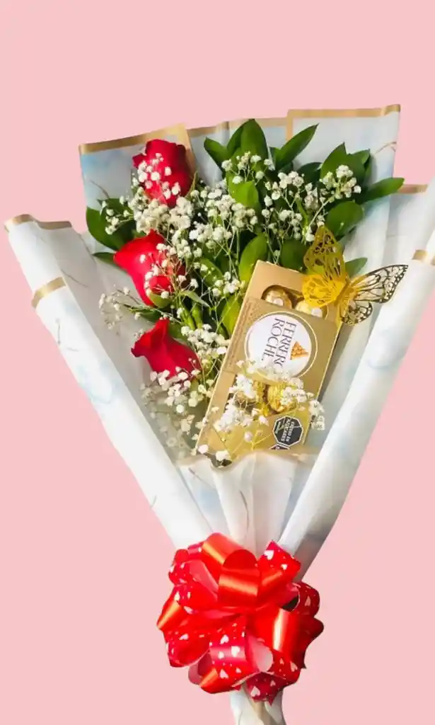 Contiene 3 rosas rojas Follaje verde Follaje blanco Chocolates Ferrero x8 Decoración