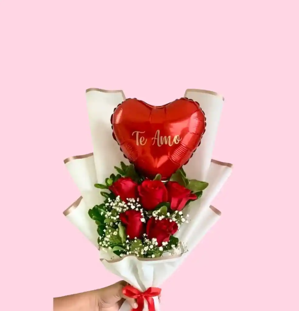 Contiene 5 rosas rojas Follaje verde Follaje blanco Globo te amo Decoración