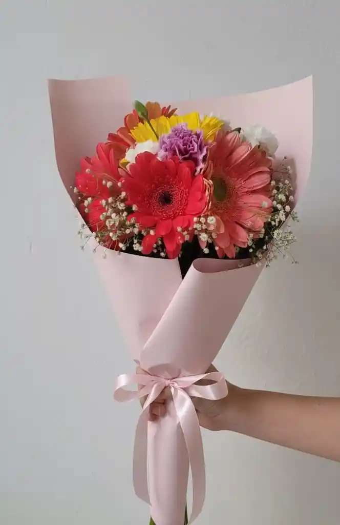 Ramo colorido y lleno de vida elaborado con gerberas en tonos rojos y amarillos, acompañadas de flores blancas y rosadas que aportan equilibrio y frescura. Envuelto en papel decorativo floral con amarre rústico, logrando un estilo natural y encantador. Incluye tarjeta para mensaje personal, ideal para expresar alegría, cariño y buenos deseos. Perfecto para cumpleaños, celebraciones o para regalar una sonrisa en cualquier momento.