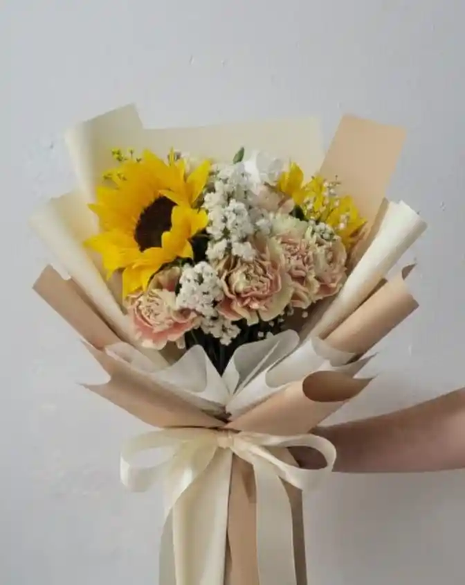 Un detalle cálido y lleno de luz, perfecto para cualquier ocasión. Este ramo destaca por un girasol grande y radiante en el centro, rodeado de 6 claveles en tono beige/nude que le dan un toque suave y natural. Está decorado con flores blancas tipo nube y follaje amarillo (solidago) que resalta su brillo. Viene envuelto en papel coreano bitono en tonos café y arena, terminado con un lazo de satén color champaña. Es el regalo ideal para enviar buenas vibras, desear un feliz día o simplemente agradecer a alguien especial con mucha alegría.