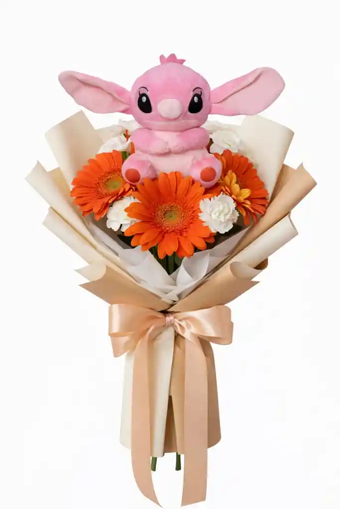 Ramo floral vibrante y encantador compuesto por 5 gerberas color naranja, 4 claveles blancos, gypsophila (nube blanca) y follaje natural. Incluye peluche Angela de 20 cm, perfecto para dar un toque dulce y especial. Presentado en envoltura en tonos beige con lazo de cinta satinada. Incluye tarjeta para mensaje especial, ideal para sorprender con un detalle alegre y lleno de amor