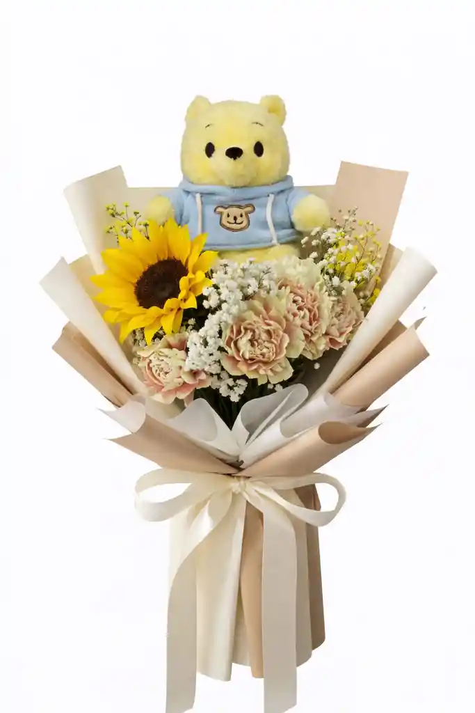 Ramo floral tierno y luminoso compuesto por 1 girasol, 4 claveles en tono crema, gypsophila (nube blanca), flor amarilla de relleno y follaje natural. Incluye peluche Pooh de 22 CM, ideal para acompañar el detalle con un toque dulce y especial. Presentado en envoltura en tonos beige y crema, finalizado con lazo de cinta satinada. Incluye tarjeta para mensaje especial, perfecta para expresar cariño en cualquier ocasión 🌼🧸✨