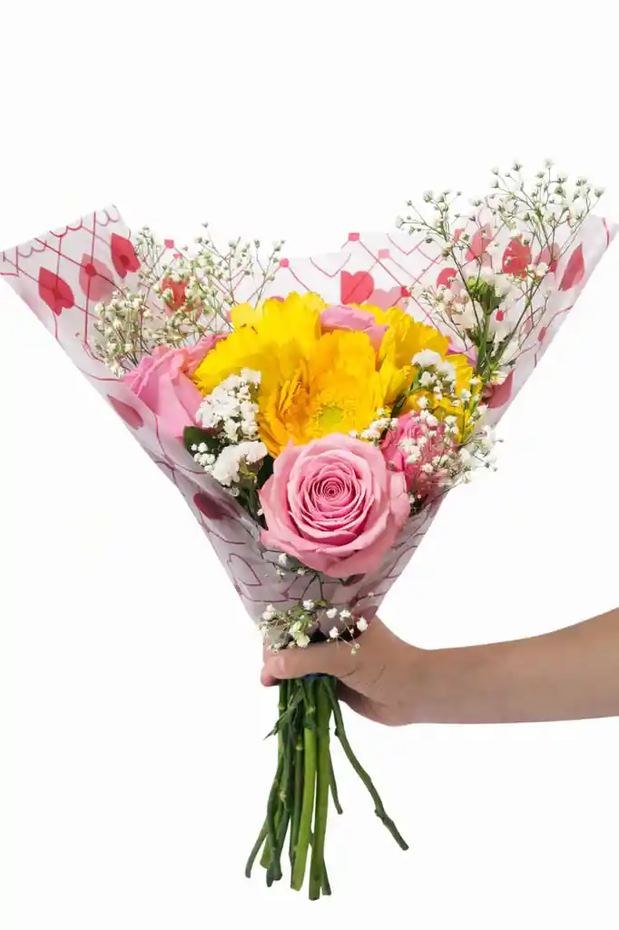 Ramo romántico elaborado con girasoles frescos y una rosa rosada central, acompañados de delicado follaje que realza su belleza natural. Envuelto en papel coreano decorativo, que le da un acabado elegante y moderno. Incluye tarjeta para mensaje personal, ideal para expresar sentimientos y convertir este detalle en un regalo inolvidable. Perfecto para aniversarios, cumpleaños o para sorprender con amor y alegría.