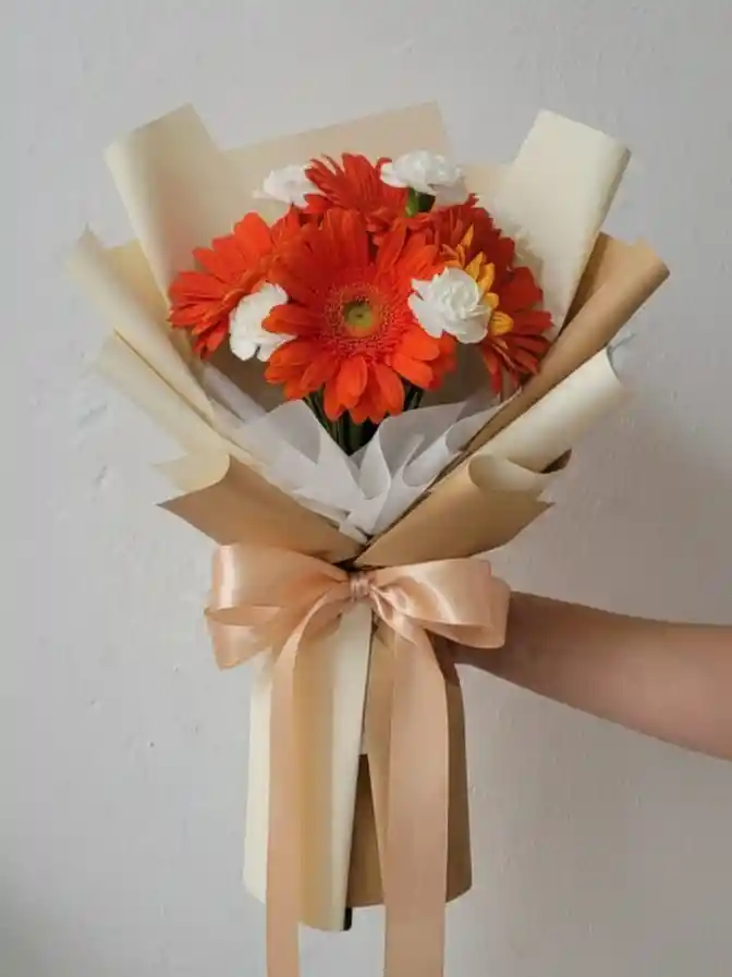 Ramo fresco y lleno de energía elaborado con gerberas en tonos amarillo y naranja, acompañadas de delicado follaje natural que aporta un estilo campestre y armonioso. Envuelto en papel decorativo floral con amarre rústico, ideal para un acabado natural y encantador. Incluye tarjeta para mensaje personal, perfecta para transmitir alegría, cariño y buenos deseos. Ideal para cumpleaños, agradecimientos o para iluminar el día de alguien especial.