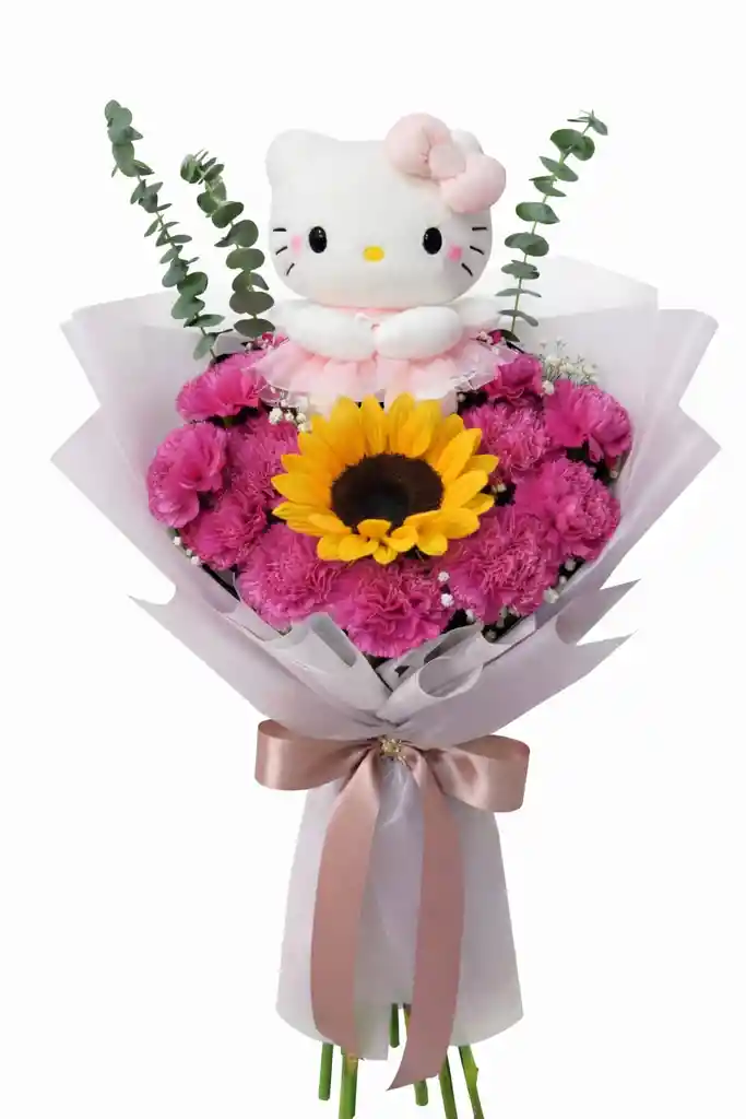 Ramo Hello Kitty & Girasol 🎀🌻 ¡El detalle más cute para alegrar el día! Este ramo combina la ternura de un peluche de Hello Kitty (18 cm) con la energía de un girasol gigante al centro. Está rodeado por 10 claveles fucsia súper coloridos y ramitas de eucalipto que huelen delicioso. Viene envuelto en papel coreano blanco con un moño rosa de satén, listo para regalar. Es perfecto si buscas algo diferente, tierno y con mucha personalidad para un cumpleaños o simplemente para dar una sorpresa especial.