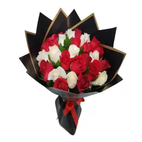 RAMO DE ROSAS ROJAS Y BLANCAS, DECORADO EN PAPEL COREANO NEGRO.