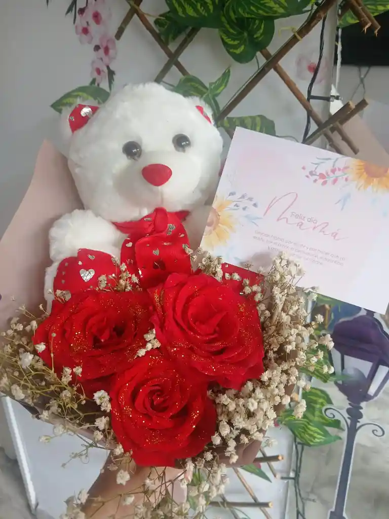 Bouquet de 3 rosas, peluche mediano y tarjeta personalizada.