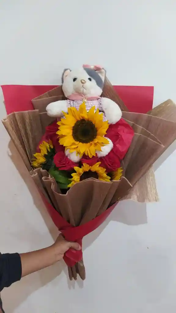 Incluye: girasoles x3, rosas x7, peluche ( puede variar según disponibilidad), decoración en bouquet y mensaje personalizado el cual debe ser dejado en el chat con el domiciliario de color Multicolor ideal para el Felicitaciones