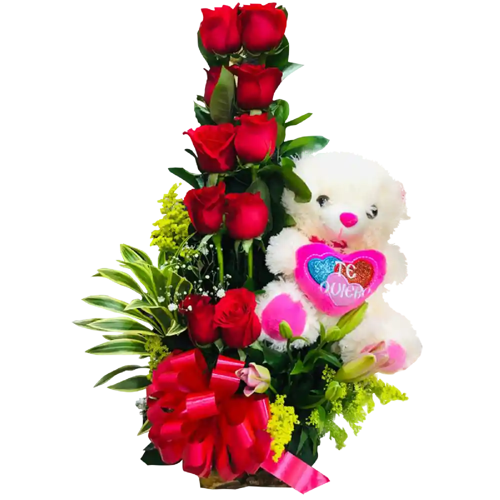 Ternurita escalonada. dile feliz día de la mujer a ese ser amado con este lindo detalle. Rosas rojas y osito de peluche - Flores Rosas RojasForma EscalonadoTamaño 45cm de alto x 35cm de anchoCinta de Moño Satinada RojaCantidad de Flores 10 Rosas rojasPeluches Osito de Peluche 30cmFollajes Solidago Amarillo. Gipsophilia blanca. Canción de la india y ruscusPapel de Empaque Caja de madera 15cm x 15cm