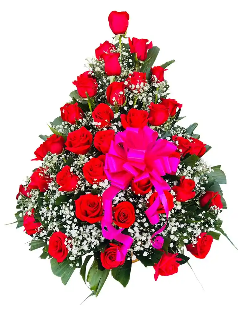 Arreglo floral x30 rosas tipo exportación en tonalidad rojo Follaje fino gipsófilia, rusco Moño en satín fucsia Diseño elaborado en base corteza de madera de 15x15