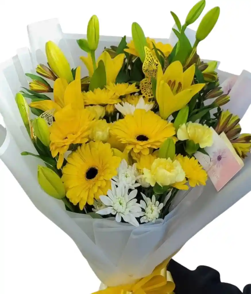 Ramo variado en tonos amarillos, lleva gerbera, lirio, margarita, clavel, astromelias y otros Incluye: Papel decorativo premium, moño artesanal y fino follaje. Personalización: Si deseas agregar una tarjeta con mensaje o remitente, por favor escríbelo en la sección de "Comentarios" al realizar tu pedido o indícalo por el chat a tu Rappitendero.