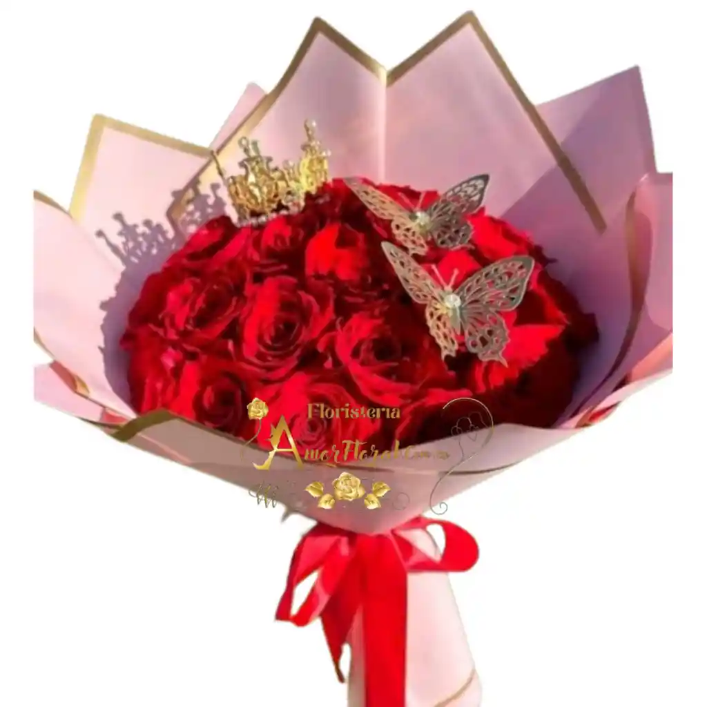 bouquet por 24 rosas, mini corona, mariposas, papel decorativo, moño y tarjeta con mensaje, si deseas un mensaje para la tarjeta lo puedes dejar escrito en el área de observaciones o escribirnos al whatsapp al 3143111616 y enviarnos el mensaje para la tarjeta.