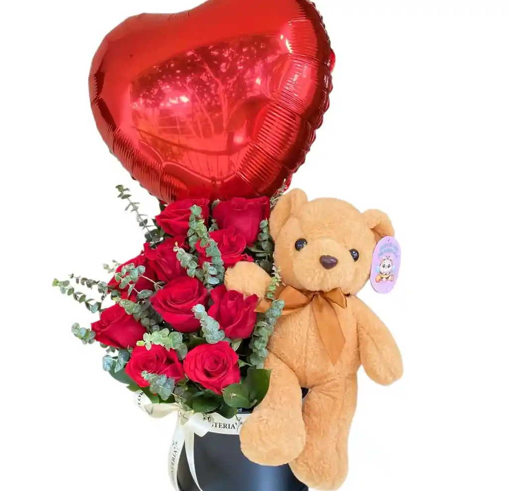 Contiene 1 oso peluche Globo Cilindro decorado 10 rosas rojas Follaje verde Ramo de San Valentín Arreglo floral de San Valentín San Valentín Ramo de mujer arreglo florar de mujer Arreglo floral de aniversario Ramo de aniversario