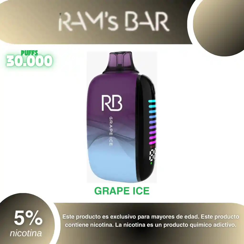 Rams Bar 30.000 Puffs, Uva Mentolada 5% PROHIBIDA LA VENTA A MENORES DE EDAD. ADVERTENCIA: ESTE PRODUCTO CONTIENE NICOTINA, LA NICOTINA ES UNA SUSTANCIA QUIMICA ADICTIVA Y NOCIVA PARA LA SALUD. Los líquidos para vapeo contienen: propilenglicol USP, glicerina USP, sabor artificial y nicotina. Este producto puede contener nicotina, una sustancia altamente adictiva que puede generar dependencia, posibles afectaciones arteriales, cardiacas, pulmonares y otras aun no identificadas. No se recomienda su uso a mujeres en embarazo, puede generar lesiones al feto. Mantener alejado de niños y mascotas. No ingerir, puede generar irritación y/o intoxicación. Por favor antes de consumir consulte a su médico posibles afectaciones o sensibilidad a alguno de sus componentes. Los componentes de este producto pueden aumentar la sensación de ansiedad En caso de notar alguna reacción adversa por favor suspenda su uso de manera inmediata. Siga las instrucciones en el envase. No alterar sus componentes. Adquiera sus productos en sitios de confianza No use productos piratas, alterados, o en los cuales no pueda comprobar su buena procedencia, Verifique la reputación del fabricante y distribuidor antes de adquirir cualquier producto Si no es usuario fumador o vapeador no se recomienda su uso bajo ninguna circunstancia Al usar este producto usted es consciente que este producto puede generar afectaciones a su salud, incluyendo aquellas que a la fecha de la compra no se han identificado y que pueden aparecer a largo plazo.