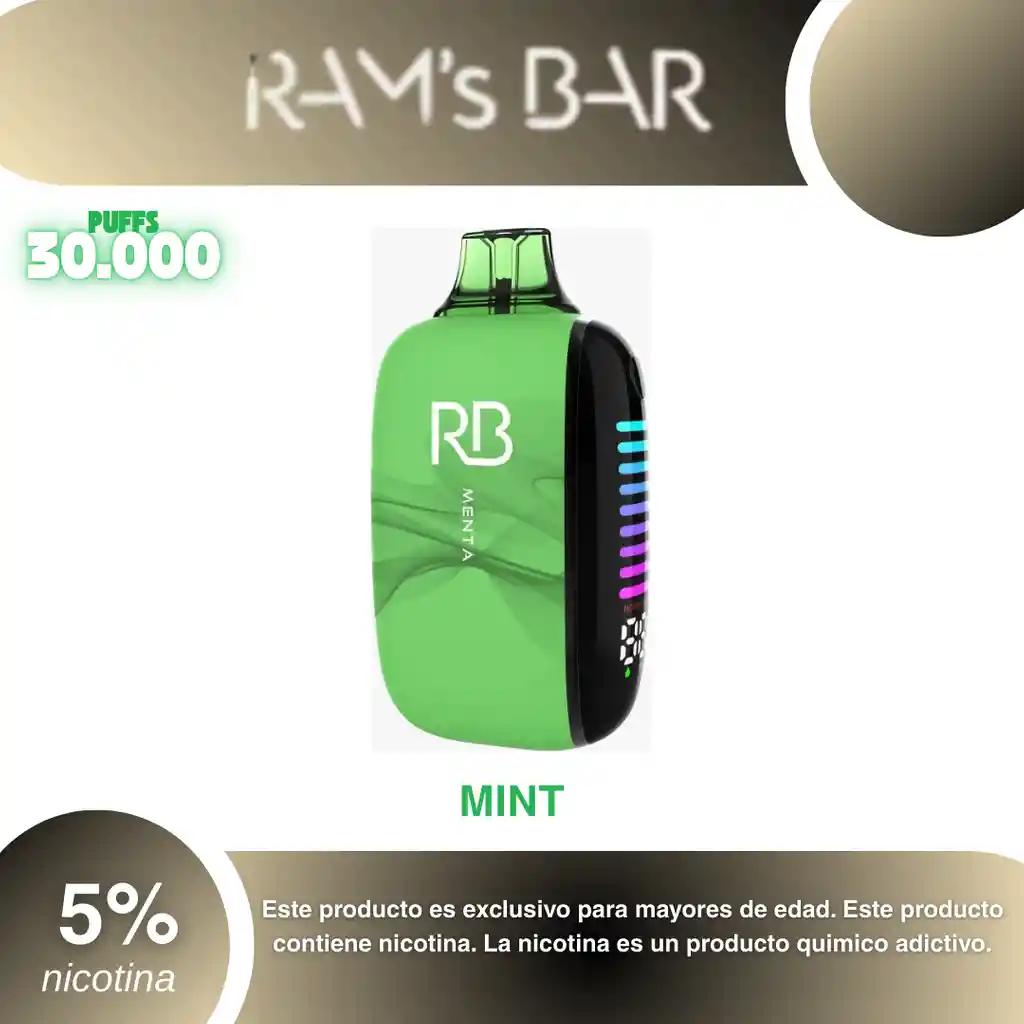 Rams Bar 30.000 Puffs, Menta 5% PROHIBIDA LA VENTA A MENORES DE EDAD. ADVERTENCIA: ESTE PRODUCTO CONTIENE NICOTINA, LA NICOTINA ES UNA SUSTANCIA QUIMICA ADICTIVA Y NOCIVA PARA LA SALUD. Los líquidos para vapeo contienen: propilenglicol USP, glicerina USP, sabor artificial y nicotina. Este producto puede contener nicotina, una sustancia altamente adictiva que puede generar dependencia, posibles afectaciones arteriales, cardiacas, pulmonares y otras aun no identificadas. No se recomienda su uso a mujeres en embarazo, puede generar lesiones al feto. Mantener alejado de niños y mascotas. No ingerir, puede generar irritación y/o intoxicación. Por favor antes de consumir consulte a su médico posibles afectaciones o sensibilidad a alguno de sus componentes. Los componentes de este producto pueden aumentar la sensación de ansiedad En caso de notar alguna reacción adversa por favor suspenda su uso de manera inmediata. Siga las instrucciones en el envase. No alterar sus componentes. Adquiera sus productos en sitios de confianza No use productos piratas, alterados, o en los cuales no pueda comprobar su buena procedencia, Verifique la reputación del fabricante y distribuidor antes de adquirir cualquier producto Si no es usuario fumador o vapeador no se recomienda su uso bajo ninguna circunstancia Al usar este producto usted es consciente que este producto puede generar afectaciones a su salud, incluyendo aquellas que a la fecha de la compra no se han identificado y que pueden aparecer a largo plazo.