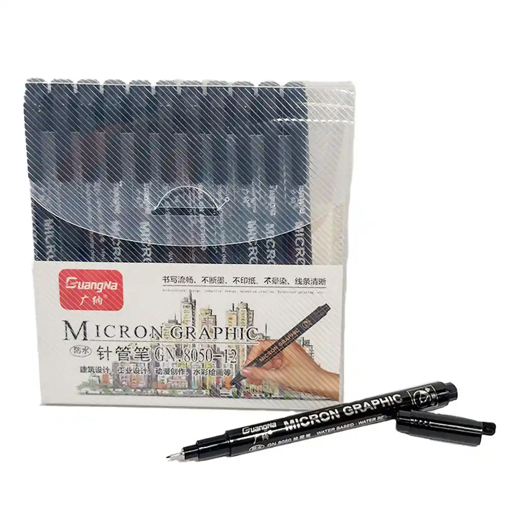 Rapidógrafo Guangna Estuche De 12 Unds Estuche de 9 Rapidógrafos negros de las siguientes puntas: Puntas redondas 0.05mm, 0.1mm, 0.2mm, 0.3mm, 0.4mm, 0.5mm, 0.7mm, 0.8mm, BR, 1, 2, 3, DETALLES DEL PRODUCTO - Punta larga de metal para dibujar, escribir y esbozar. - Perfecta para usar con plantillas y reglas. - Anchos variados - Tinta negra pigmentada, indeleble (según la norma ISO 14145-2), resistente a la luminosidad y al agua. - Deleble sobre papel vegetal. - Estuche de plástico transparente, ideal para un almacenamiento eficiente.
