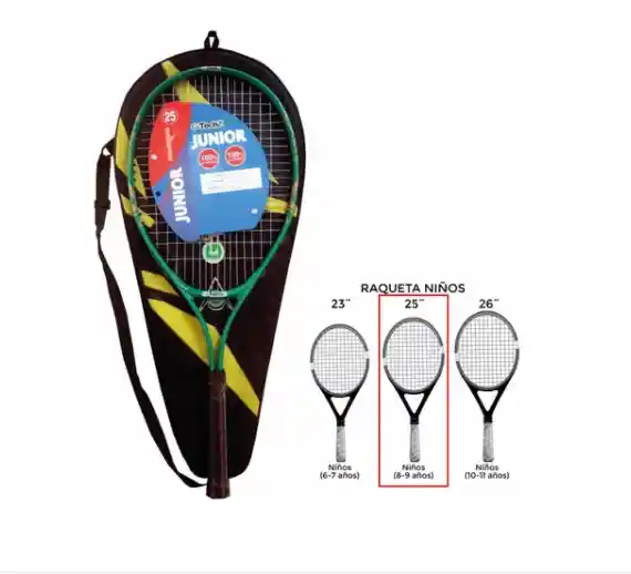 1 Raqueta junior más muñequera incluye estuche de carga envío bajo ningún costoTamaño de cabeza: 98Largo: 25 Deporte: TenisComposición: Aluminio dos cuerpos