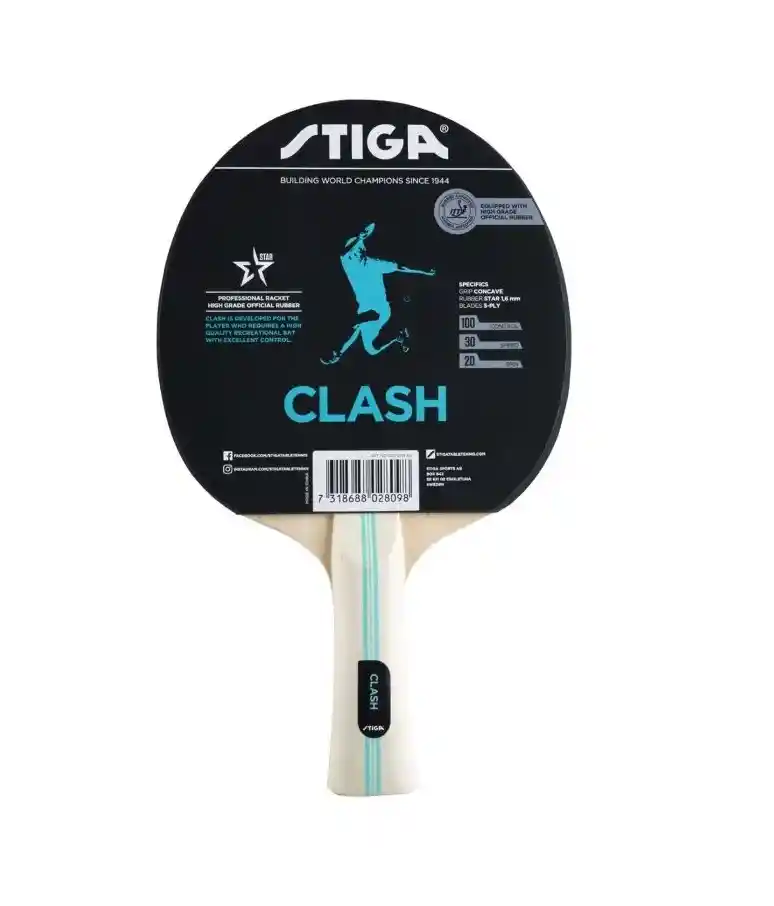 PALETA PARA PING PONG STIGA CLASH Hobby Clash es la pala de tenis de mesa ideal para principiantes o niños que quieran probar este deporte. Esta pala proporciona todo el control necesario para aprender los conceptos básicos mientras se divierten. Hobby Clash tiene un mango cóncavo para un agarre cómodo y goma de 1 estrella con esponja de 1,6 mm. CARACTERÍSTICAS: Raqueta: 5 Capas Forma del Mango: Cóncavo Calibre de la espuma: 1.6 mm Aprobada por la ITTF (Federación Internacional de Tenis de Mesa) PUNTUACIÓN : Velocidad: 30 Rotación: 20 Control: 100